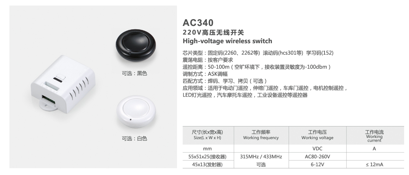 应用领域:适用于电动门遥控,伸缩门遥控,车库门遥控,电机控制遥控,