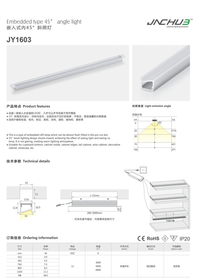 这是一款嵌入式安装的LED灯,几乎可以齐平安装于预开槽里,只留15°左右的凸起部分